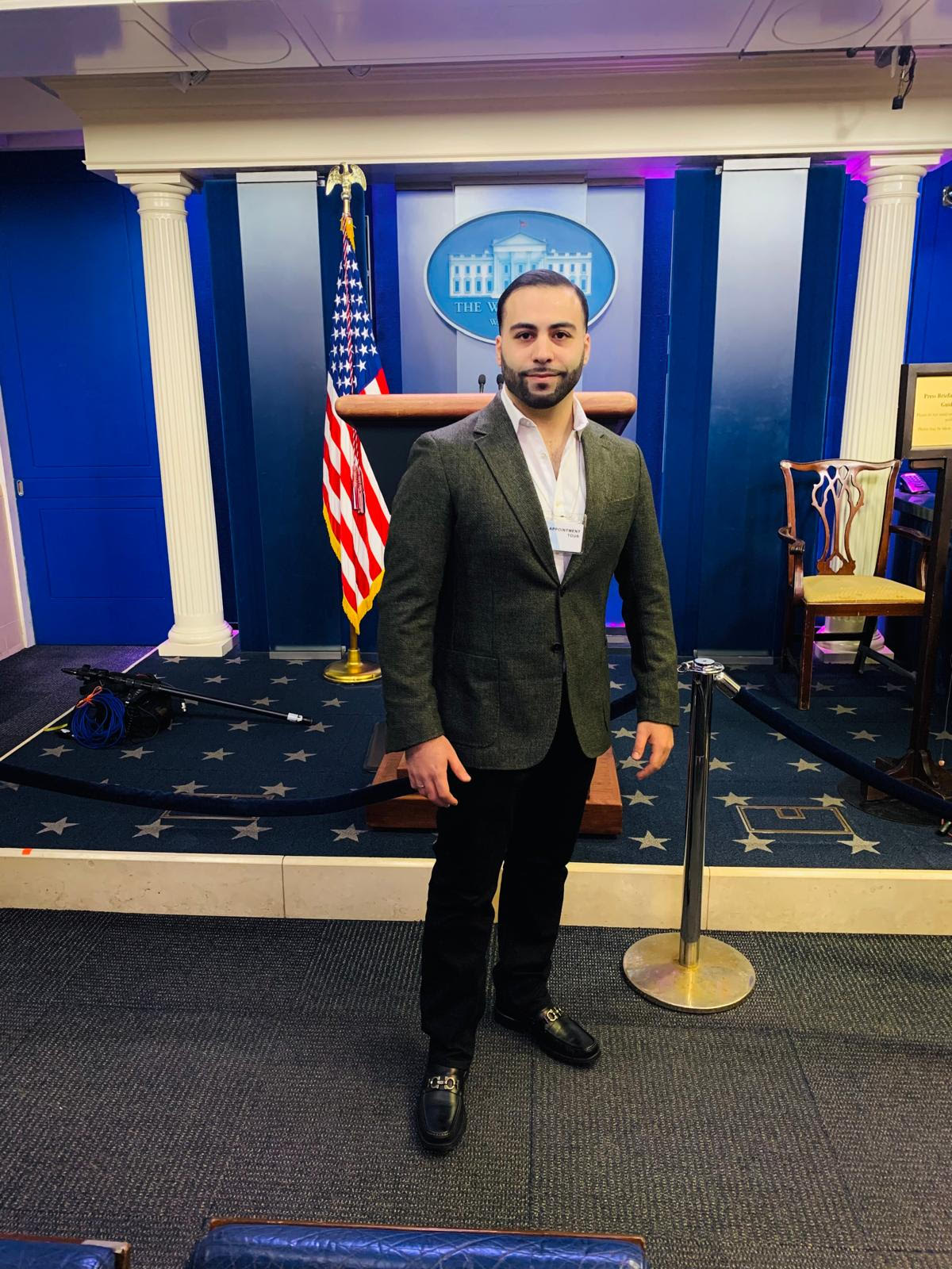 Dr. Amin Halum at the White House Press Room — representing the growing influence of Arab-American leadership in U.S. policy, diplomacy, and global affairs.
