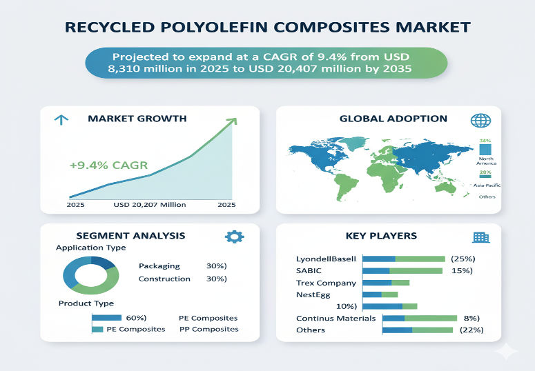 ROCKVILLE, MD, UNITED STATES, October 21, 2025 /EINPresswire.com/ -- The global Recycled Polyolefin Composites Market is poised for strong growth, evolving from an estimated USD 8.31 billion in 2025 to approximately USD 20.41 billion by 2035, representing a compound annual growth rate (CAGR) of about 9.4%. This expansion reflects the accelerating shift toward circular materials, stringent sustainability mandates, and the increasing integration of recycled polyolefins in packaging, automotive, and construction sectors.
