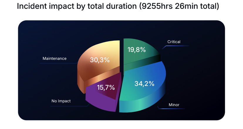 - No-impact incidents: Minor issues accounted for 8% of incidents and 16% of the total duration, representing events that were logged but did not actively disrupt user operations.