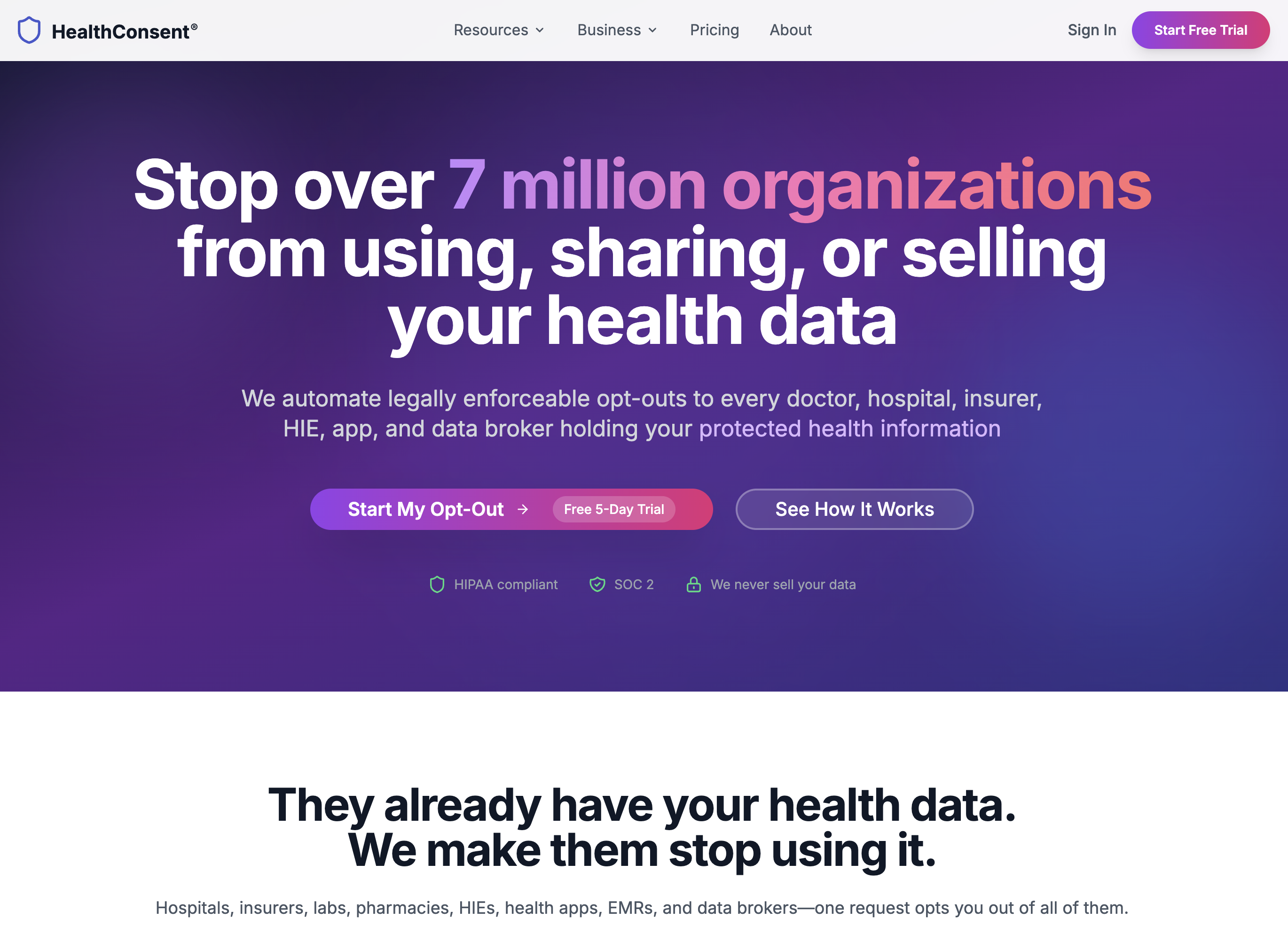 NEWPORT BEACH, CA, UNITED STATES, October 1, 2025 /EINPresswire.com/ -- HealthConsent today announces its launch as an artificial intelligence (AI) startup focused on empowering Americans to proactively manage their personal health data privacy. Founded in Newport Beach, the company offers an AI-powered platform designed to automate the process of privacy requests, including opt-out, suppression, and deletion requests across millions of healthcare data holders.
