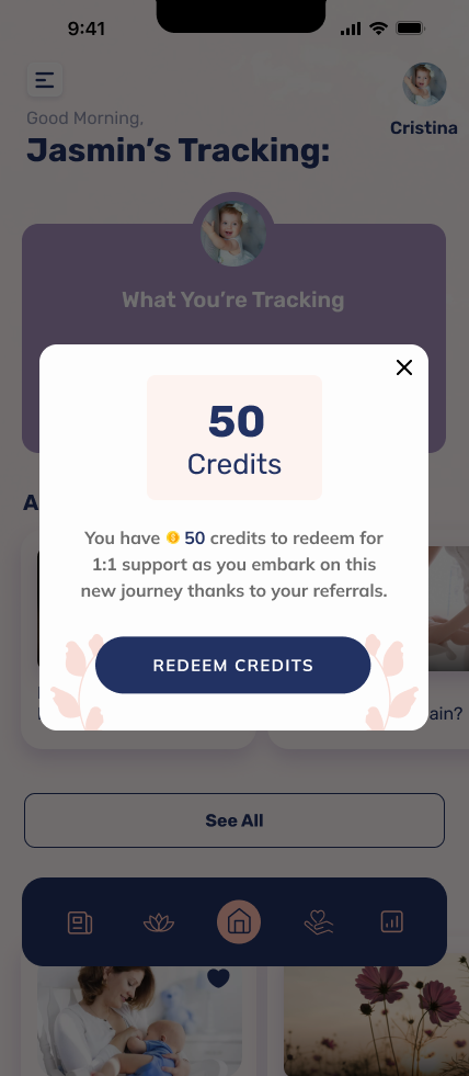 Parents can earn unlimited credits (up to $50 per referral) by inviting friends to subscribe, building their village of support with expert-led coaching.