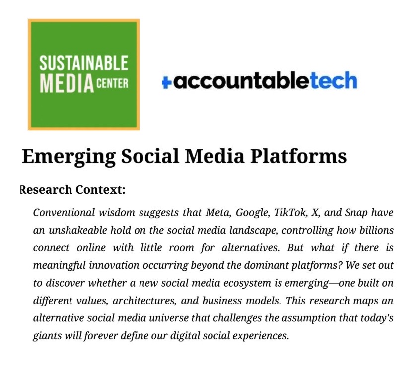 The report, The Future of Social Media: There is Hope, produced in collaboration with the Sustainable Media Center (SMC) and Accountable Tech, maps a fast-growing ecosystem of more than 150 alternative platforms that are building a healthier, more ethical foundation for digital life. The study categorizes and analyzes 67 of these platforms in depth, tracking how decentralized networks, minimalist apps, and community-driven spaces are reclaiming what social media was supposed to be: social.